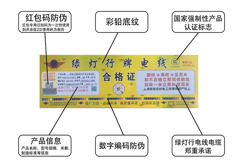 綠燈行電線產(chǎn)品合格證的編碼暗紋防偽標(biāo)識,同時具有防偽紅包碼用以掃描查詢辨別真假。
