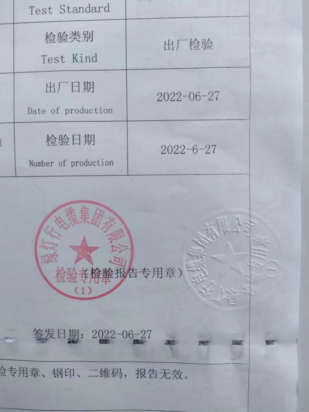 綠燈行電線電纜產(chǎn)品檢驗(yàn)報(bào)告均加蓋鋼印標(biāo)識。